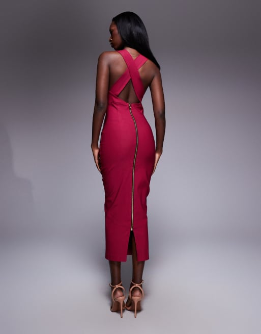 Vesper Plunge neck bodycon midaxi dress with cross straps in raspberry