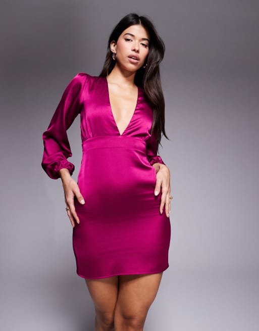 Vesper Plunge neck long sleeve satin mini dress in fuchsia