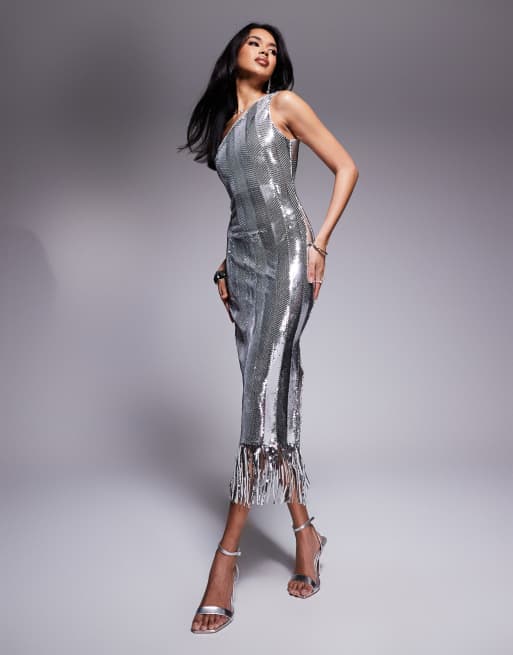 Vesper Sequin one shoulder midaxi dress in silver