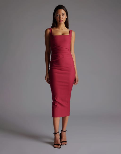 Vesper Square neck midaxi dress with waist pleats in raspberry