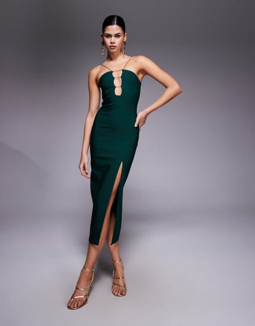 Vesper Strap detail midaxi dress with side split in forest green