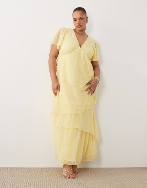 Vila Curve tiered dobby ankle dress in pale yellow