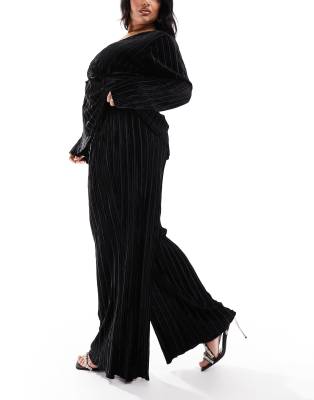 Vila Curve velvet plisse wide leg trouser co-ord in black