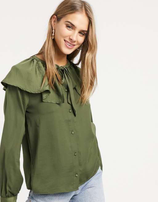 Vila blouse with exagerated tie collar and balloon sleeve in green