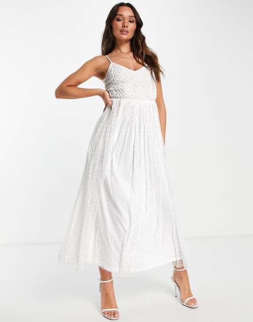 Vila Bridal embellished bodice maxi dress with cut out back in white dobby