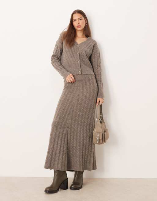 Vila cable knit maxi skirt co-ord in light brown melange
