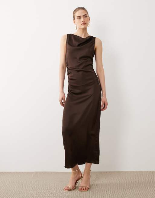 Vila cowl neck satin midi dress in chocolate brown