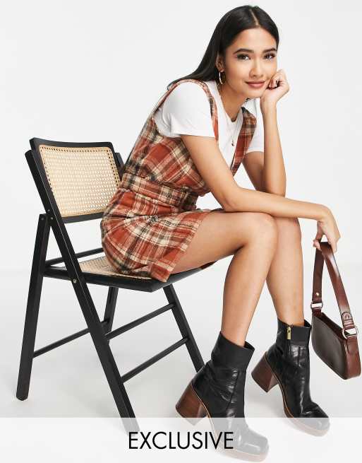 Vila Exclusive mini pinafore dress with belt in orange check
