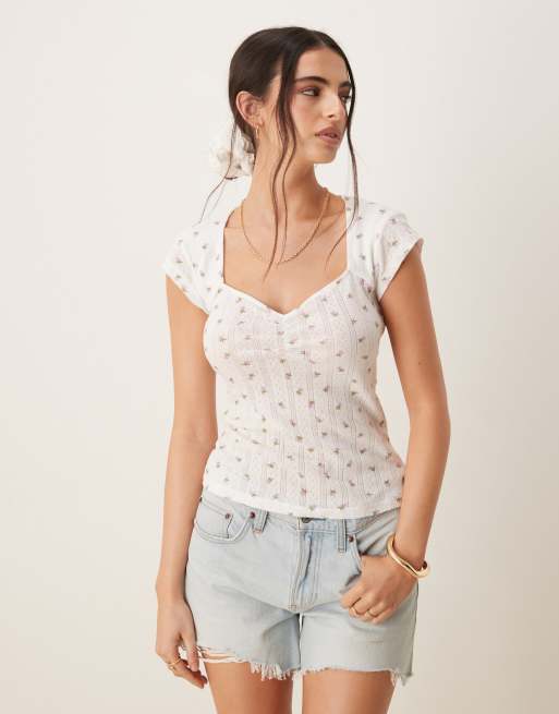Vila pointelle sweetheart neckline t-shirt in pink ditsy floral