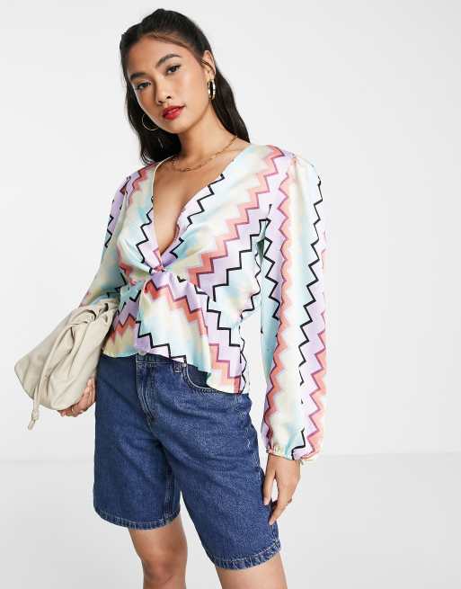 Vila satin blouse co-ord with twist front in pastel zig zag print