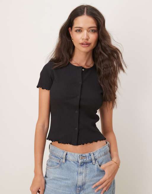 Vila short sleeve lettuce edge t-shirt with popper front in black