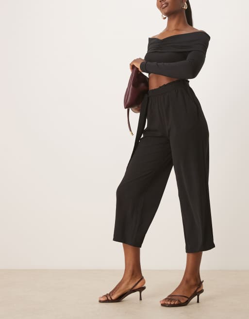 Vila tie waist straight leg cropped trouser in black