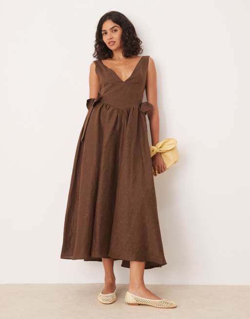 VRG GRL daphne linen ruffle detail midi dress in chocolate brown
