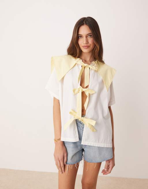 VRG GRL romy tie-detail smock blouse in white and lemon
