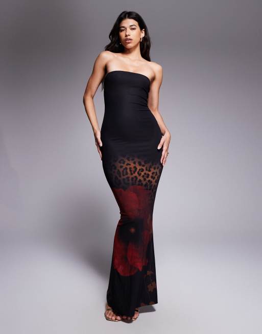 Wanderdoll sculpting bandeau bodycon maxi dress in leopard and red floral print