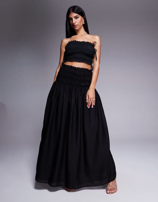 Wanderdoll Soulie linen look ruffle trim tie detail shirred bandeau top co-ord in black