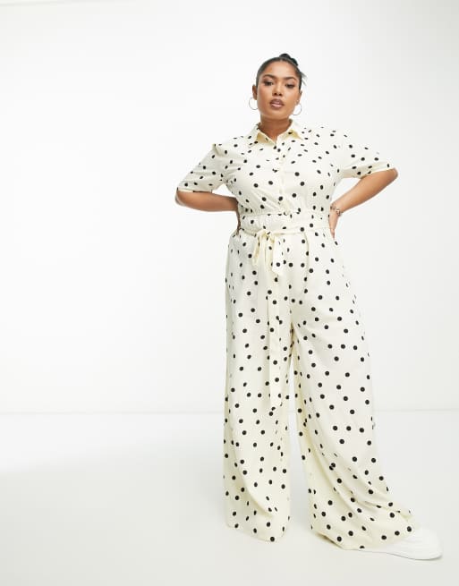 Wednesday's Girl Curve polka dot wide leg button through jumpsuit in cream