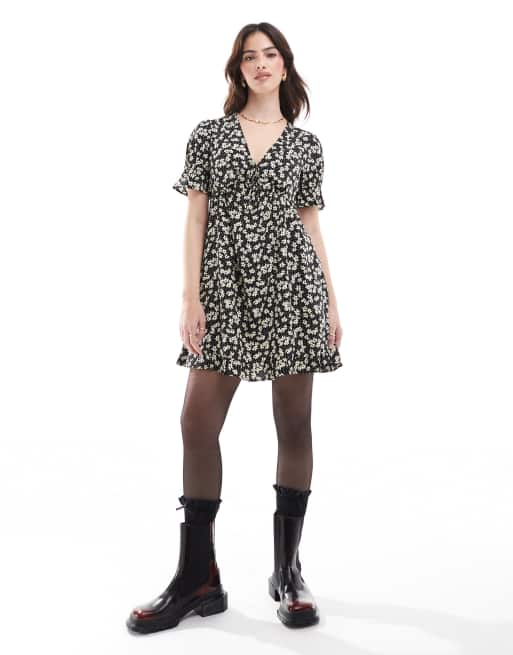 Wednesday's Girl flutter sleeve floral print mini dress in black and white