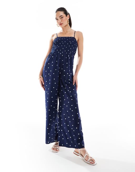 Wednesday's Girl polka dot smocked jumpsuit in navy and cream