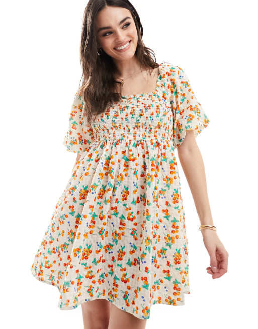 Wednesday's Girl textured floral print shirred mini smock dress in multi