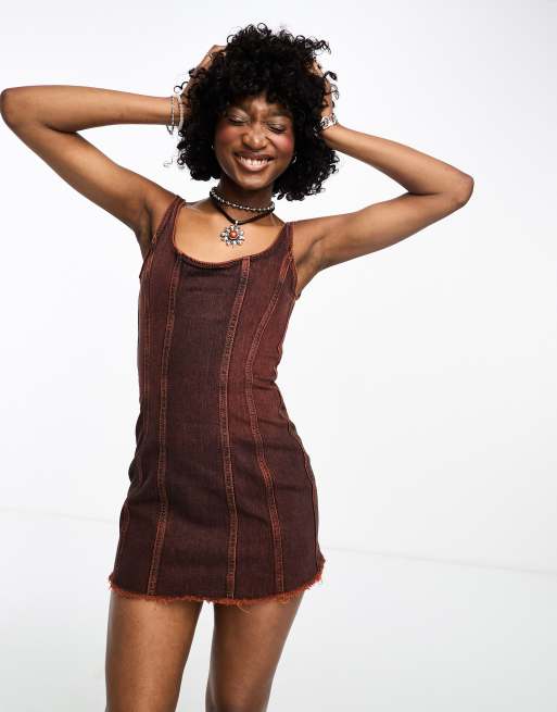 Weekday Alvarado zip through denim mini dress in rusty red wash