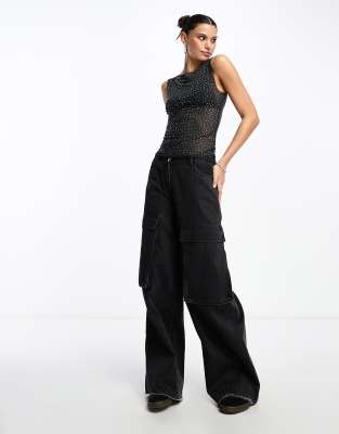 Weekday Annie boatneck rhinestone mesh tank top in off-black