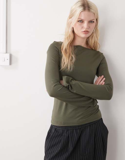 Weekday Annie super soft long sleeve boat neck top in khaki exclusive to ASOS