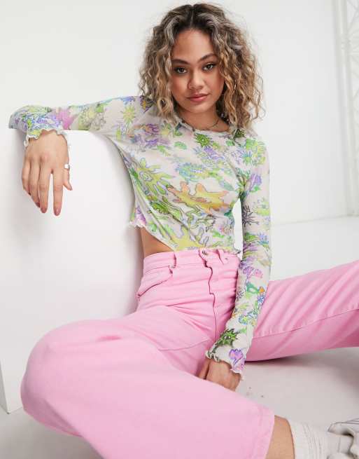 Weekday cotton Sena printed mesh long sleeve top in all over print floral - WHITE