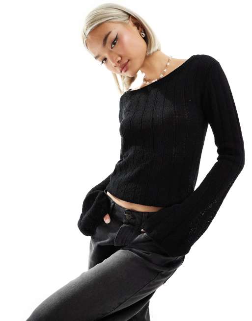 Weekday semi sheer slim fit jumper with flare sleeve in black