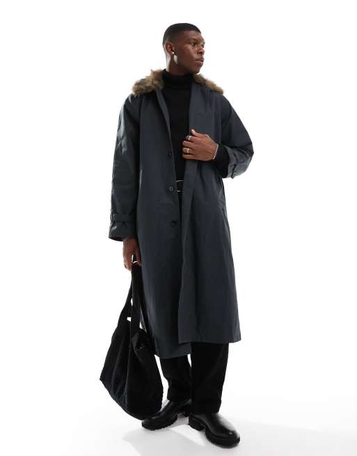Weekday Wade oversized trench coat with faux fur collar in off-black