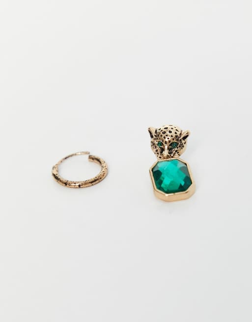 WFTW leopard stud drop earrings with green stone in gold