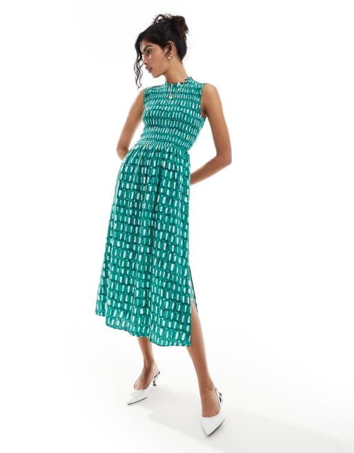 Whistles Heidi shirred midi dress in green and white smudge