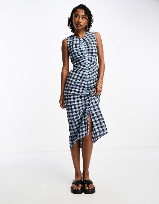 Whistles ruched gingham midi dress in blue