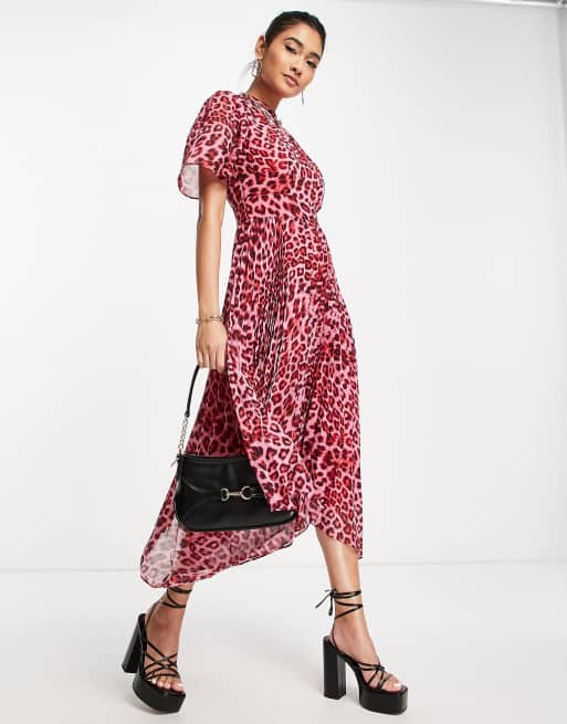 Whistles short sleeve pleated midi dress in pink leopard