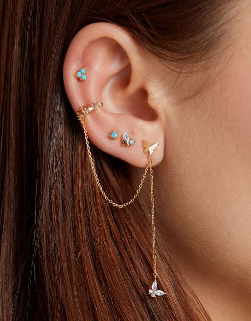With Bling crystal butterfly stud earring & chained ear cuff for right ear in gold plate