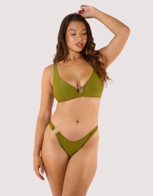 Wolf & Whistle Kalahari high shine bikini top with gold ring in khaki