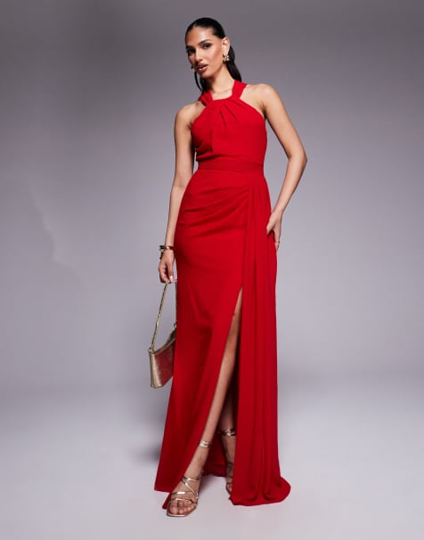 Goddiva One shoulder pleated fan maxi dress in red