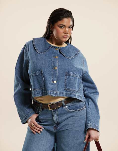 ASOS DESIGN Curve denim jacket with round collar in mid blue co-ord