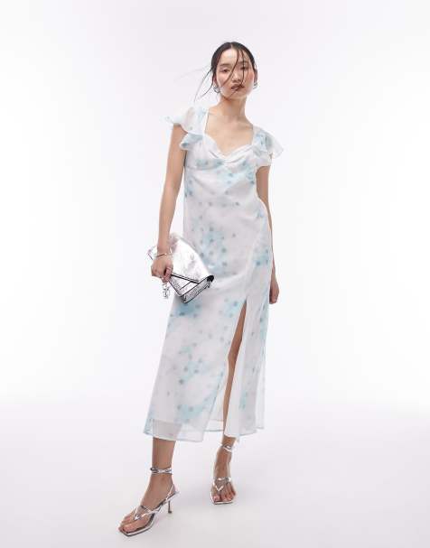 Hope & Ivy ruffle detail sheer midaxi dress in blue and white palm print