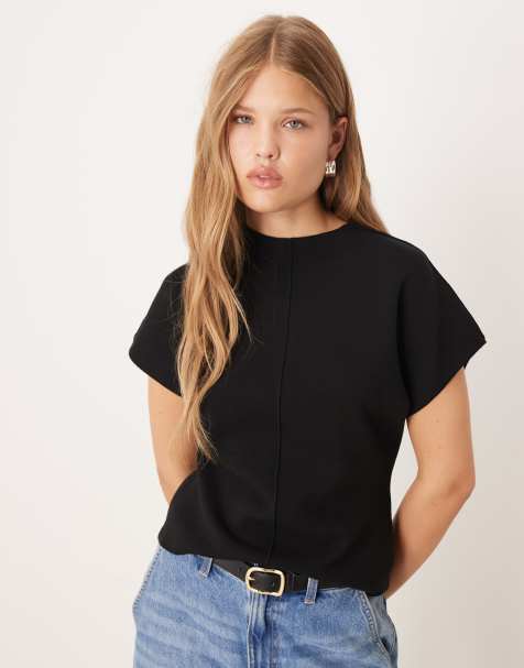 Gina Tricot short sleeve drape boat neck top with elbow sleeves in black