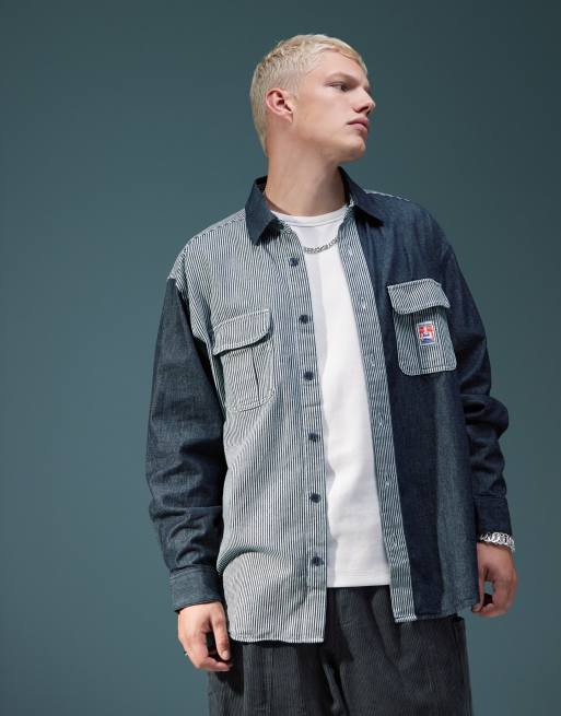 Wrangler Casey Jones workwear colourblock stripe/plain denim shirt relaxed fit in dark wash