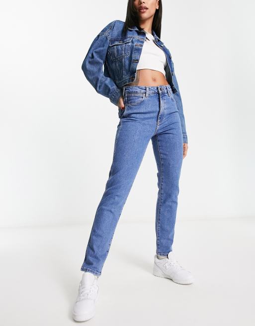 - Stretch denim: mid-blue wash