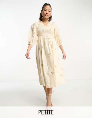Y.A.S Petite shirred bodice smock midi dress with floral embroidery in cream
