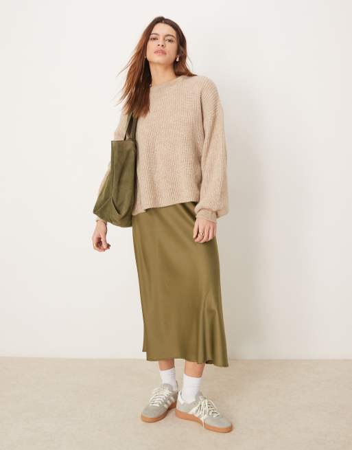 YAS satin midi skirt in olive green