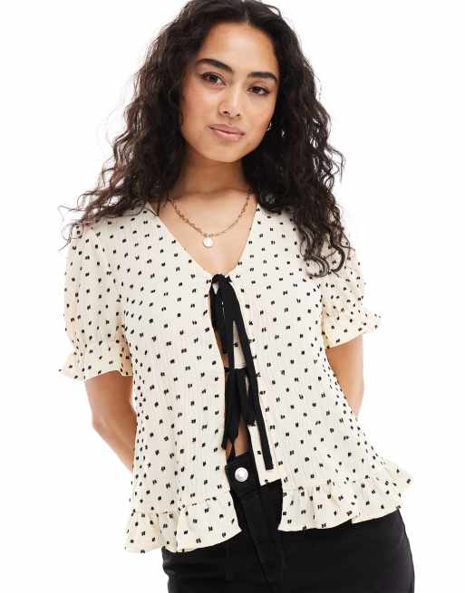 Y.A.S textured dobby tie front blouse in cream and black