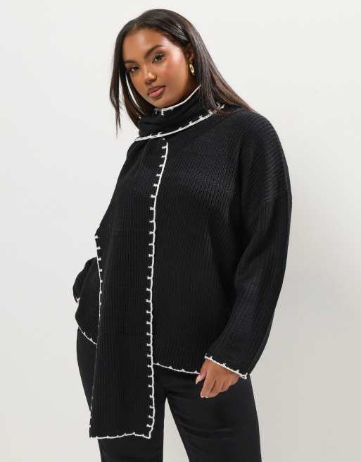 Yours Clothing Blanket stitch scarf detail jumper in black