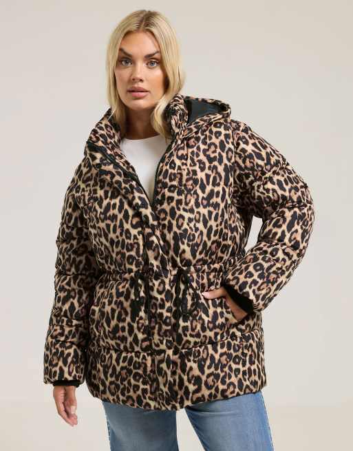 Yours Clothing Leopard short padded coat in brown