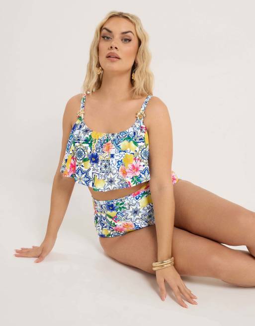 Yours Clothing Mediterranean frill bikini top in white