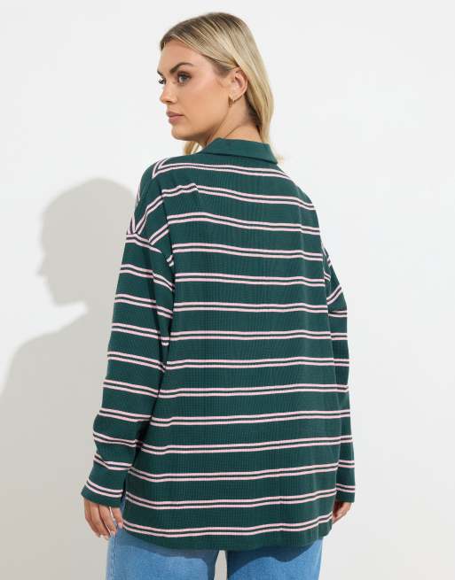Yours Clothing Stripe waffle rugby collar top in blue
