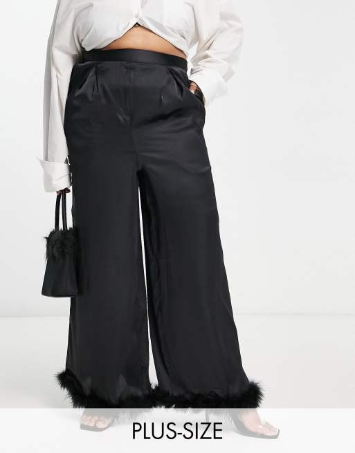 Yours Exclusive co-ord fluffy trim satin wide leg trousers in black